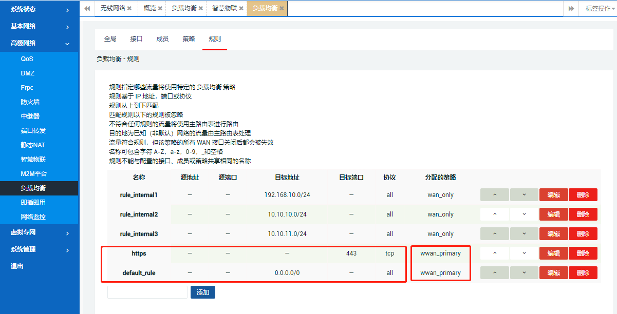 balanced: 指同时使用wan有线网络和3G/4G拨号网络;默认两者流量比例为1:1, 可具体修改;