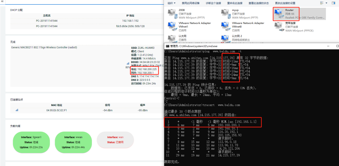 电脑端进行ping外网和路由表跟踪测试,一般有线wwan带宽比4G带宽会高许多,所以延时比较小的,即是使用无线接口流量的。