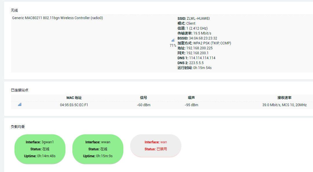 2)选择“系统状态”–“概览”页查看无线客户端的ip地址连接状态,成功如下: