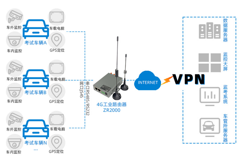 智能驾考系统利用4G工业路由器把车载电脑、视频监控、GPS定位信息、车辆传感器信息等实时传输给考试中心(监控大屏、考车信息、考场公屏)以及考试服务器、公安服务器中。考生可以顺利获得考场公屏实时观看场内考生的驾驶考试情况和查看考试结果、进场顺序,监考中心可以顺利获得考车信息和监控大屏实时远程监控每个考生的考试情况。 豪门国际ZR2000系列4G工业路由器作为智能驾考的核心通信设备,驾驶考试现场终端设备顺利获得串口RS485/RS232或网口JS45的方式与无线路由器连接,再顺利获得4G/3G/APN专网的方式与监考中心建立VPN连接,实现监考中心对现场考试情况进行远程实时监控的目的。